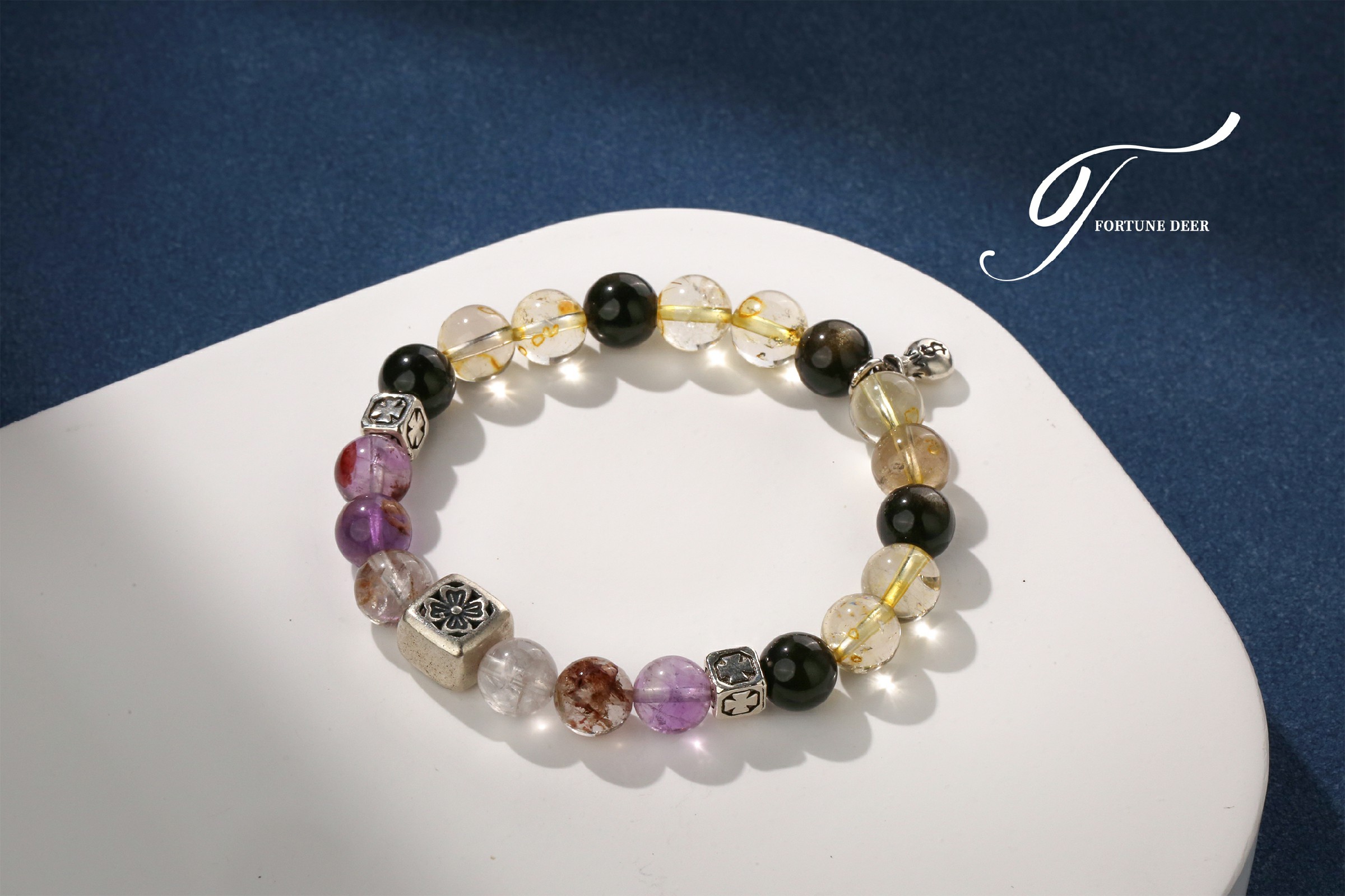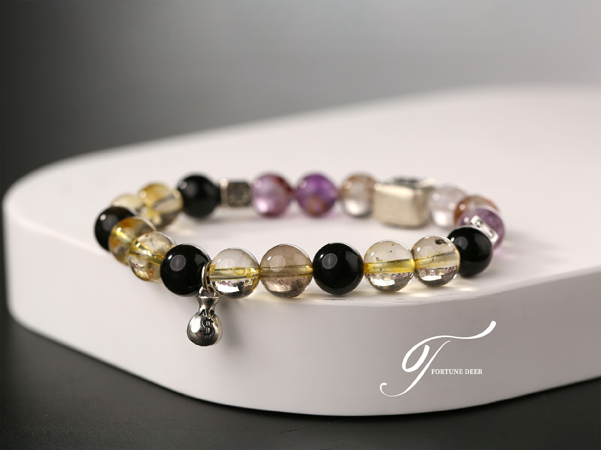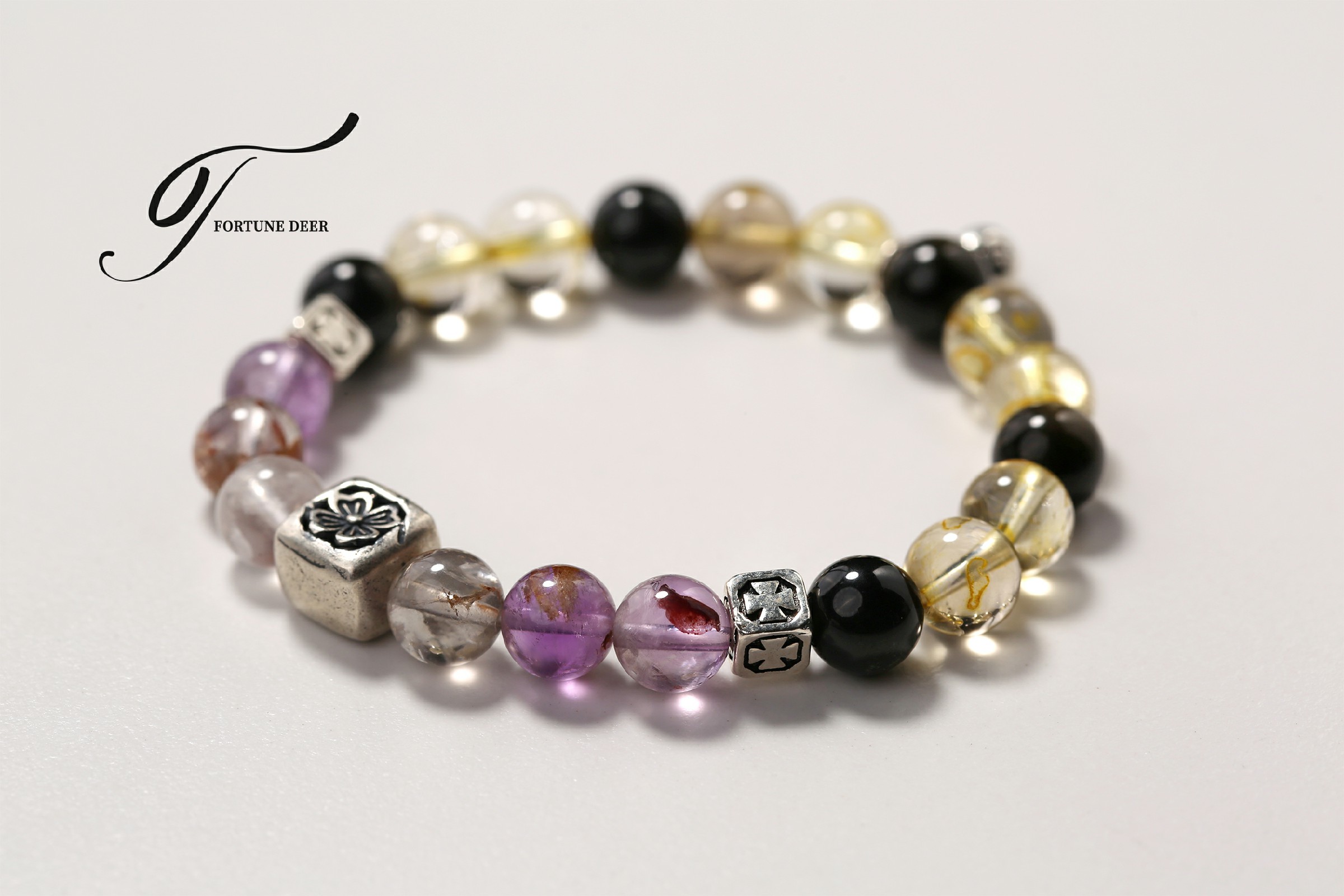 This bracelet combines the mystical energy of colored phantom quartz and the radiant glow of golden rutilated quartz. The colored phantom quartz helps clear negative energy, while the golden rutilated quartz brings vitality, growth, and emotional healing. Silver charms add a touch of spiritual protection and balance. Wear it to invite transformation and positive energy into your life.