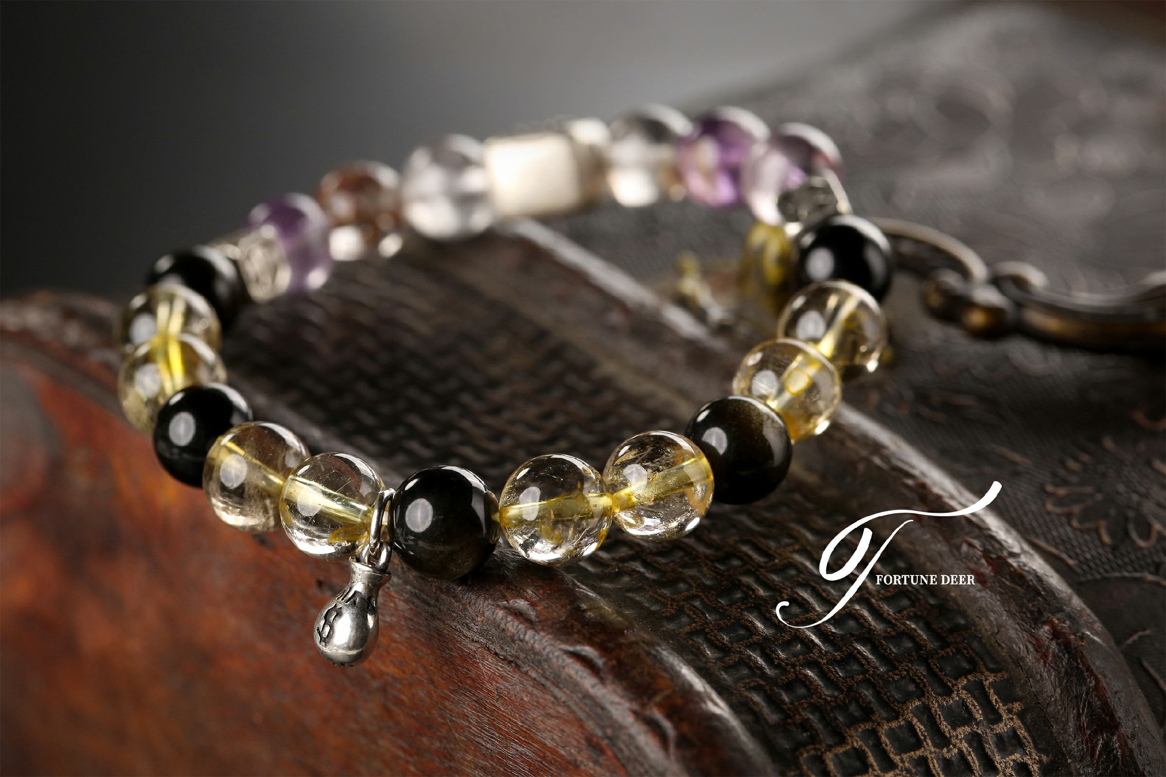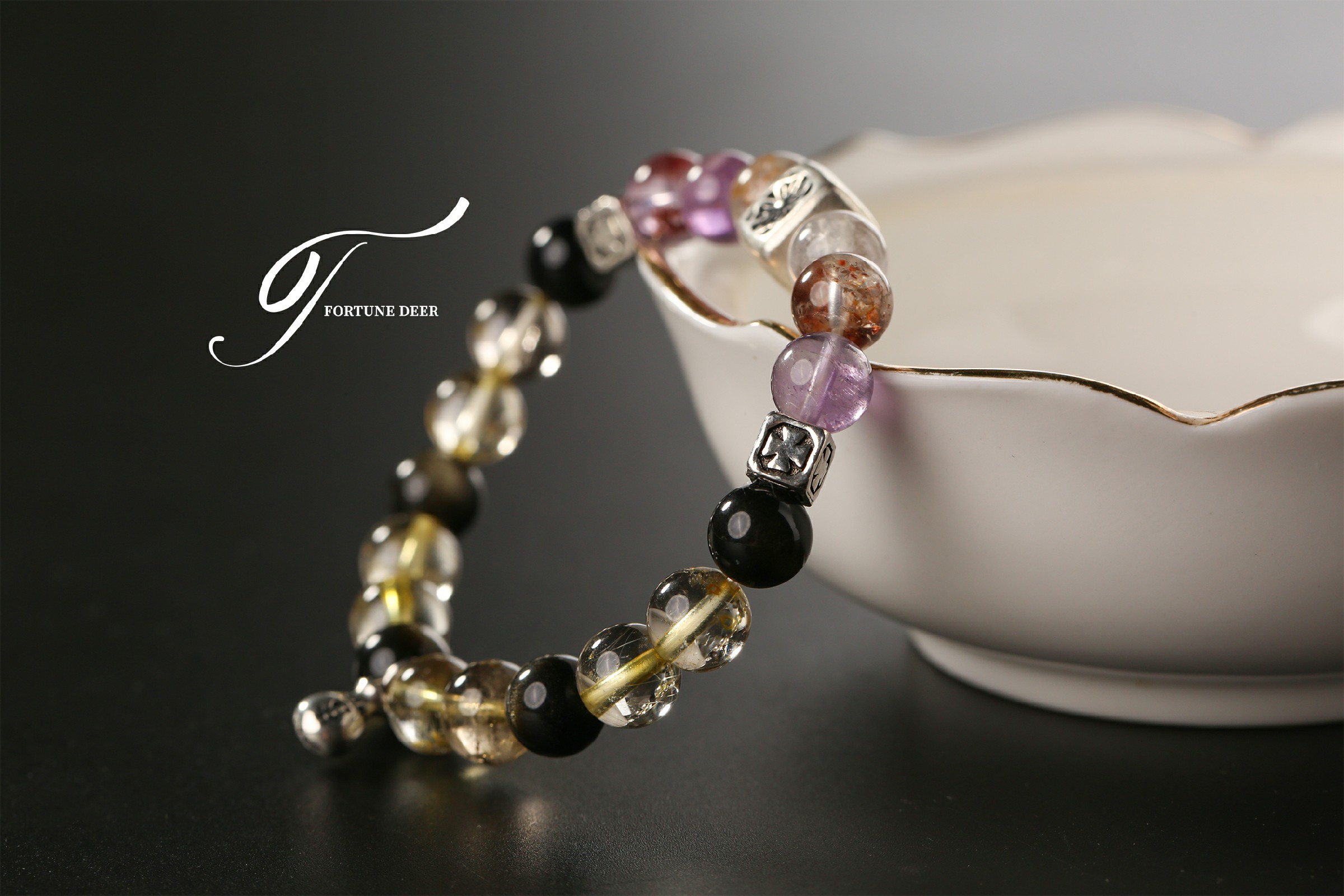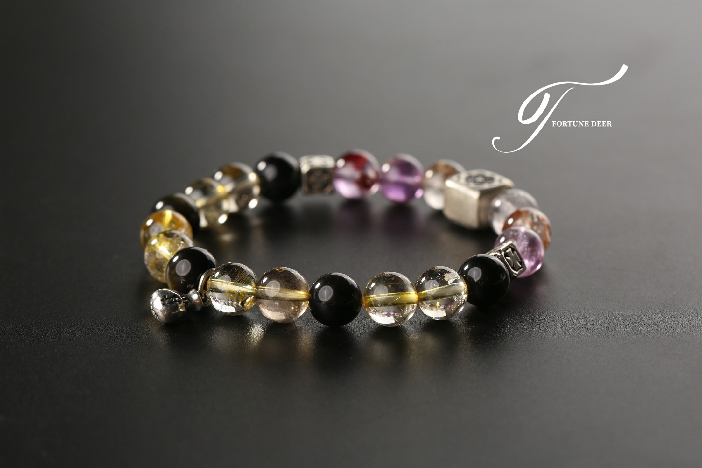 This bracelet combines the mystical energy of colored phantom quartz and the radiant glow of golden rutilated quartz. The colored phantom quartz helps clear negative energy, while the golden rutilated quartz brings vitality, growth, and emotional healing. Silver charms add a touch of spiritual protection and balance. Wear it to invite transformation and positive energy into your life.